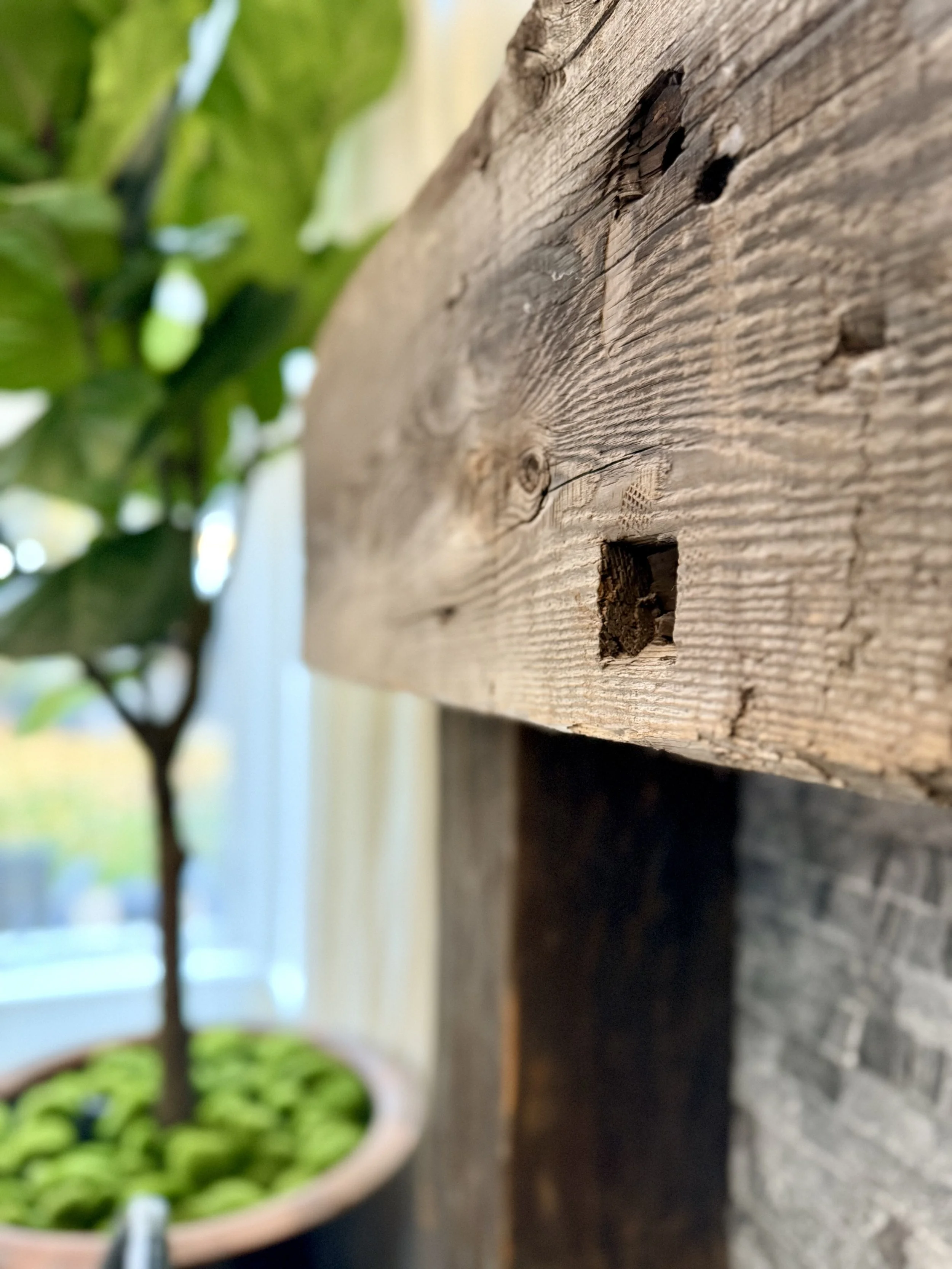 The header of the mantel was reclaimed from an 1800’s mill in northern Idaho. The Mantel pillars were reclaimed from the Boise-Payette Lumber Co. mill (c. 1906) in nearby Barber Valley. - Check it out in the Great Room Gallery.