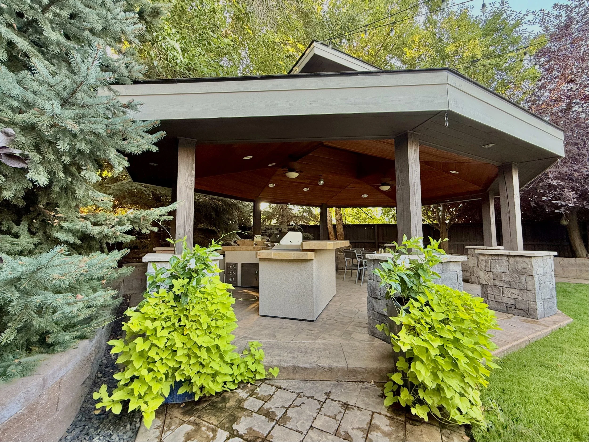 The backyard is anchored by a 600sf heavy-timber cabana that features a full kitchen (gas grill, gas cooktop, sink, refrigerator, storage), with a hookup for a gas fireplace, with a heat dissipating, wrap-around misting system. - Check it out in the Backyard Gallery.